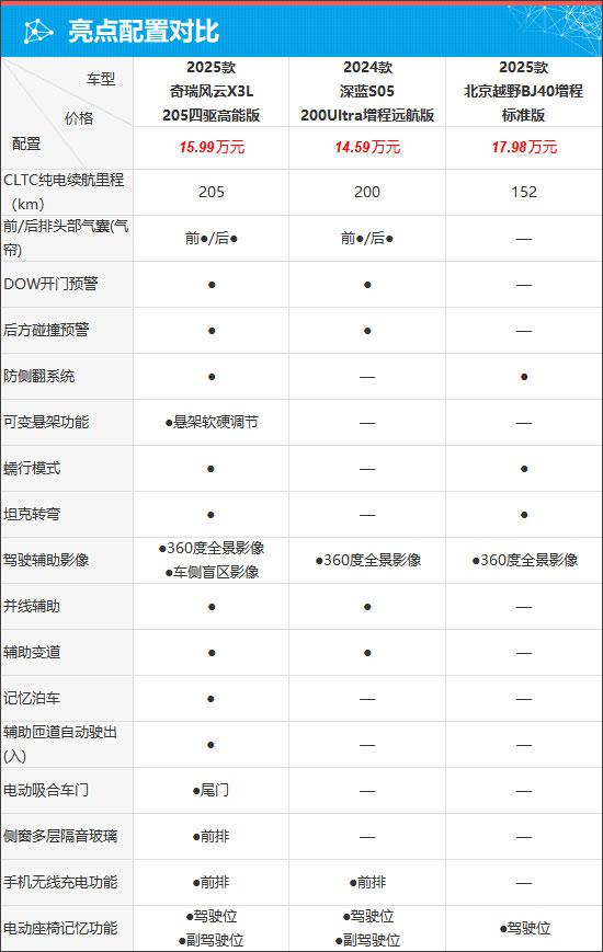在15萬元左右的價(jià)格區(qū)間,采用增程式動(dòng)力的緊湊型SUV車型并不多。為此,我們挑選了深藍(lán)S05增程版、北京越野BJ40增程這兩款極具代表性的產(chǎn)品,通過各方面對(duì)比,來看看奇瑞風(fēng)云X3L都有哪些優(yōu)劣勢。