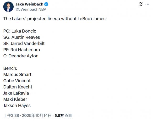 北京時(shí)間10月15日,距離新賽季NBA常規(guī)賽開打僅剩一周。因詹姆斯受傷,湖人隊(duì)賽季初期的陣容安排出現(xiàn)變動(dòng)。著名記者Jake Weinbach給出了自己的預(yù)測(cè),但主帥雷迪克表示最終首發(fā)五人仍未確定。