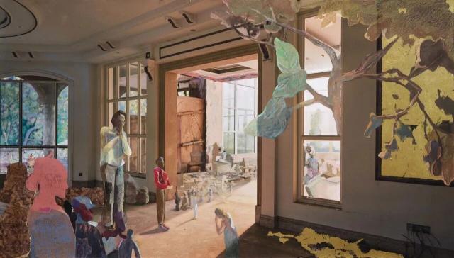 展廳內(nèi),《局外人》系列新作格外引人注目。這組作品的靈感源于2020年陳彧君在浙江橫店的一段經(jīng)歷:一棟停工的豪華“樓王”別墅,讓他捕捉到時(shí)代發(fā)展中的微妙瞬間。殘留的裝修痕跡里,既蘊(yùn)含著人們對(duì)美好生活的向往,也隱藏著全球化浪潮下審美與現(xiàn)實(shí)的錯(cuò)位。畫中荒廢的房屋被雜草覆蓋,人類空間與自然邊界悄然融合,恰如他對(duì)“局外人”的隱喻,在價(jià)值觀念離散的當(dāng)下,個(gè)體如何在變遷中尋找歸屬感。
