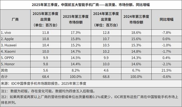 據(jù)IDC中國季度手機市場跟蹤報告顯示,2025年Q3中國智能手機總出貨量為6840萬臺,同比下降0.6%,市場整體增長動力不足。