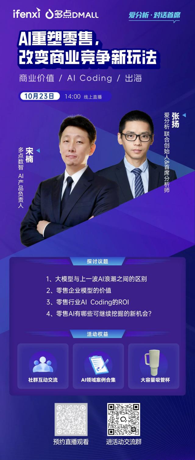 基于此,10 月 23 日 14:00,愛分析舉辦的“對話首席”直播活動,特別邀請到多點數(shù)智 AI 產(chǎn)品負(fù)責(zé)人宋楠進(jìn)行在線對談。讓我們一同探討 AI 賦能可持續(xù)零售的創(chuàng)新方向。