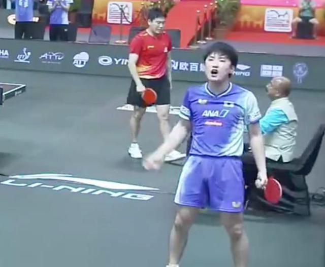 獲勝后的張本智和開(kāi)始瘋狂慶祝。他先是朝著看臺(tái)豎起手臂,大喊一聲,那表情滿是挑釁意味。接著,他又對(duì)著看臺(tái)揮舞雙臂,為自己吶喊助威。一番慶祝結(jié)束后,才與梁靖崑握手。