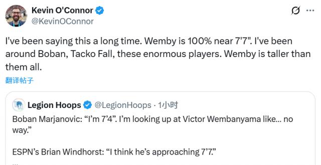 隨后,名記文霍斯特表示:“我認(rèn)為文班亞馬已經(jīng)接近2米31(7英尺7英寸)。”名記奧康納轉(zhuǎn)發(fā)此言論并強(qiáng)調(diào):“我早就說過這話!文班亞馬絕對(duì)接近2米31,我親眼見過博班、法爾這些巨人中鋒,但文班站在他們面前時(shí),比所有人都高出一截!”