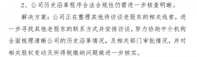 在解決方案方面,公司正在整理其他待訪談老股東的相關(guān)線索,進(jìn)一步尋找他們的聯(lián)系方式并安排訪談,努力協(xié)助中介機(jī)構(gòu)全面梳理公司的歷史沿革情況以及相關(guān)部門的審批情況,同時(shí)對(duì)相關(guān)股權(quán)變動(dòng)及所得稅繳納問題做進(jìn)一步核實(shí)。
