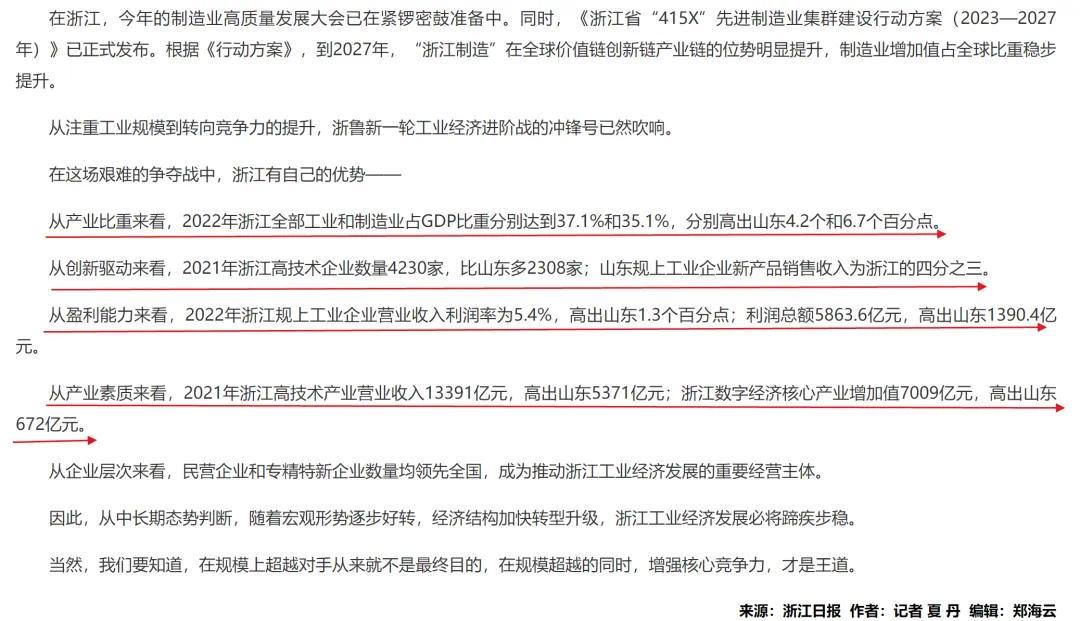 與浙江對(duì)比,2022年浙江全部工業(yè)和制造業(yè)占GDP比重分別高出山東4.2個(gè)和6.7個(gè)百分點(diǎn);2021年浙江高技術(shù)企業(yè)數(shù)量比山東多2308家,山東規(guī)上工業(yè)企業(yè)新產(chǎn)品銷售收入為浙江的四分之三;2022年浙江規(guī)上工業(yè)企業(yè)營業(yè)收入利潤率高出山東1.3個(gè)百分點(diǎn),利潤總額高出山東1390.4億元;2021年浙江高技術(shù)產(chǎn)業(yè)營業(yè)收入高出山東5371億元,數(shù)字經(jīng)濟(jì)核心產(chǎn)業(yè)增加值高出山東672億元。