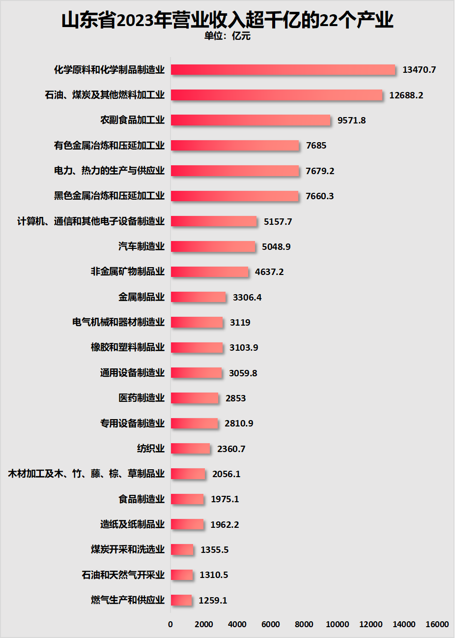 山東省工業(yè)實(shí)力強(qiáng)勁,工業(yè)營收位居全國第三,且工業(yè)門類齊全,擁有工信部劃分的41個(gè)工業(yè)大門類。但山東的產(chǎn)業(yè)結(jié)構(gòu)偏重老舊。2023年,其規(guī)上營收中,重工業(yè)占77.3%。山東省營收規(guī)模最高的產(chǎn)業(yè)包括化學(xué)原料和化學(xué)制品制造業(yè)、石油煤炭加工類、農(nóng)副食品加工業(yè)、黑色金屬冶煉與有色金屬冶煉等。此外,山東還是重要的菜籃子和糧食袋子,但產(chǎn)糧規(guī)模比不上河南。