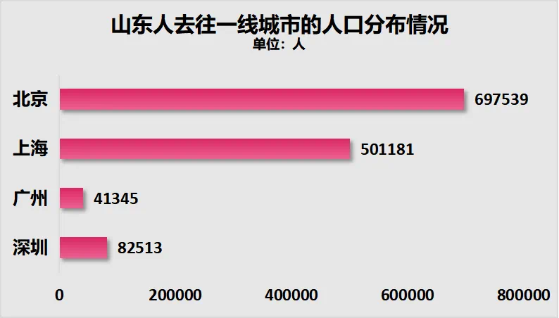 一方面,山東沒有超級(jí)城市吸引全國人口,反而被京滬虹吸。根據(jù)第七次人口普查數(shù)據(jù),山東省去往四大一線城市的人口規(guī)模為133.26萬人,其中去北京的最多,有69.75萬人,去上海的有50.12萬人。