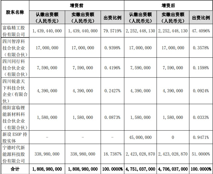 今年9月,新協(xié)議明確寧德時(shí)代將分別在2025年9月和11月支付5億和10億預(yù)付款,鎖定磷酸鐵鋰供應(yīng)量,支持江西升華布局更有競爭力的原材料建設(shè)。加上此次增資,寧德時(shí)代成功控股江西升華。增資前,富臨精工和寧德時(shí)代分別持股79.5719%、18.7387%;增資后,寧德時(shí)代持股51.00%成為控股股東,富臨精工持股47.4096%。