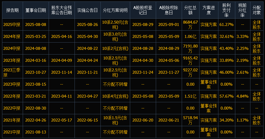 近三年,健盛集團是A股高分紅的典型企業(yè)之一。同花順數(shù)據顯示,2022 - 2024年,健盛集團合計分紅超5億元,年均分紅超1.6億元。公司股息率(最近12個月)高達5.27%。2025年,健盛集團已進行中期分紅,現(xiàn)金分紅總額為8684.67萬元。此外,2024年年報顯示,自2018年以來,公司已完成的股份回購累計數(shù)量為7795.6009萬股,使用資金總額達7.4億元。