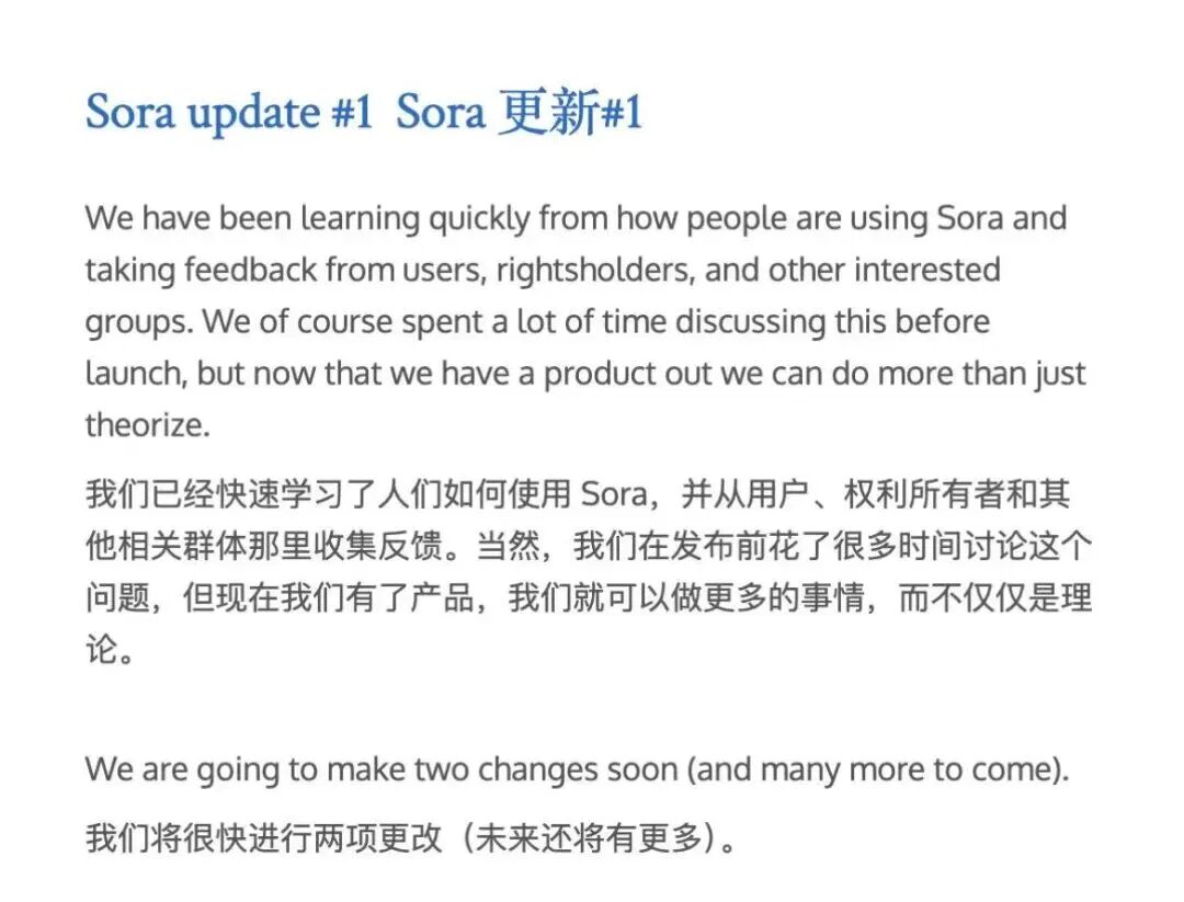 在收到大量投訴反饋之后,OpenAI開始了新的AI版權(quán)設(shè)計。OpenAI 首席執(zhí)行官薩姆·奧特曼親自發(fā)布了一篇題為 “Sora 更新#1”的博客文章,宣布了兩項重大調(diào)整,正式宣告了“選擇退出”政策的終結(jié)。