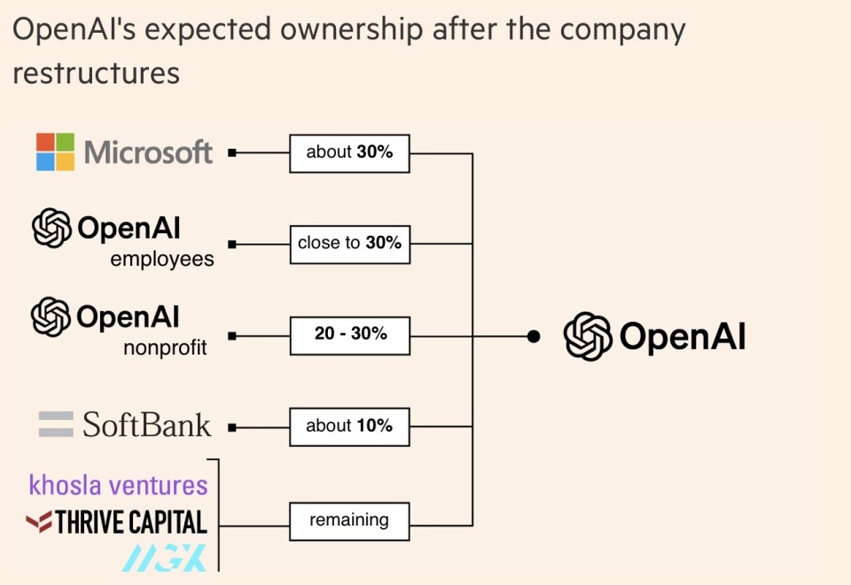 據(jù)知情人士披露,按照OpenAI當(dāng)前擬定的方案,已注資逾130億美元的微軟作為OpenAI早期主要投資者,預(yù)計(jì)將成為最大單一股東,持股約30%;公司員工持股接近30%;控制集團(tuán)的OpenAI非營利母公司持股約30%;剩余股權(quán)由軟銀(已承諾投資超300億美元)、Khosla Ventures、Thrive Capital,以及OpenAI此前收購的喬納森·伊夫(Jonathan Ive)硬件公司LoveFrom io股東瓜分。