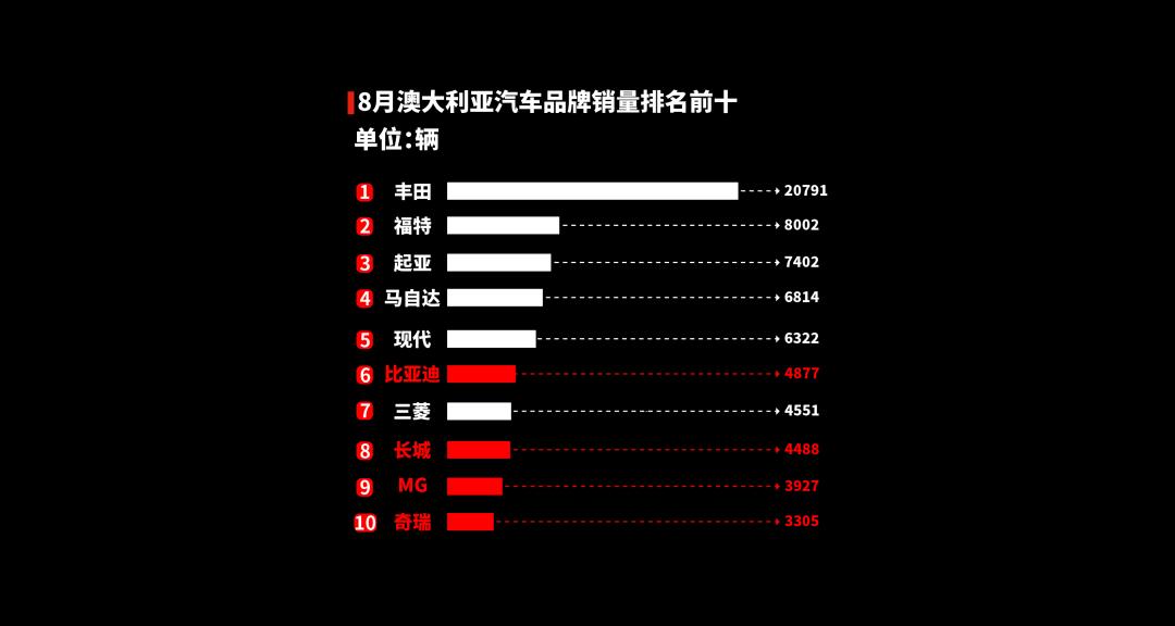 但最近幾個(gè)月,澳洲新能源車的銷量也在快速增長(zhǎng)。根據(jù)澳大利亞汽車工業(yè)聯(lián)合會(huì)(FCAI)的數(shù)據(jù),8月,比亞迪在當(dāng)?shù)氐膯卧落N量已經(jīng)超過了特斯拉。而且在8月,已經(jīng)有4個(gè)中國(guó)品牌進(jìn)入了當(dāng)月銷量Top10。