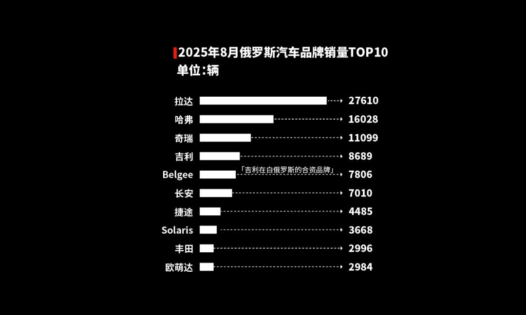 在這里,中國(guó)汽車品牌的滲透率超過60%。而在當(dāng)?shù)氐匿N量Top10中,除了俄羅斯本土品牌拉達(dá)、起亞的Solaris和豐田之外,其余全部都是中國(guó)品牌。就連去年剛上市的中國(guó)的小米汽車,都已經(jīng)出口到了這里。