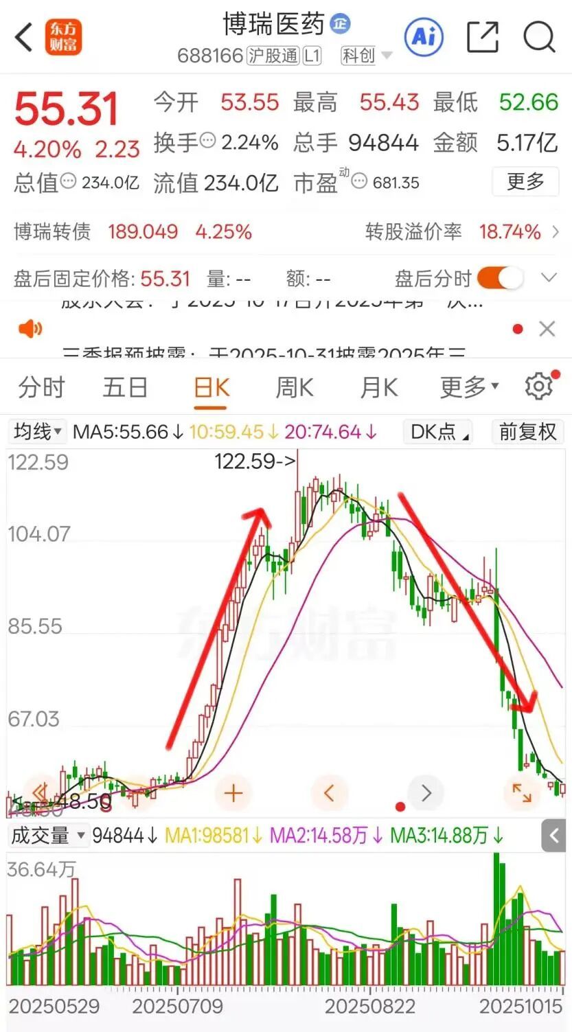 特別是從7月11日開始的一個(gè)月內(nèi),其股價(jià)快速攀升,短短一個(gè)月從55元最高漲到了120元附近。但從8月中旬開始,股價(jià)又持續(xù)暴跌,目前最新股價(jià)已跌到55.31元。短短三個(gè)月,博瑞醫(yī)藥的股價(jià)就像坐了一輪“過山車”。