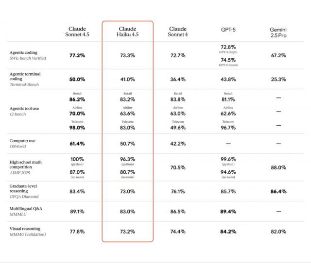 更令人驚訝的是,在部分基準(zhǔn)測(cè)試中,Haiku 4.5的表現(xiàn)已十分接近OpenAI的GPT - 5模型,不過官方也提醒,這些自報(bào)數(shù)據(jù)可能經(jīng)過篩選,應(yīng)審慎看待。