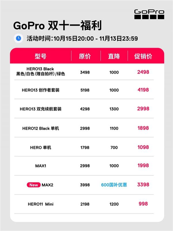 如今,GoPro MAX 2已正式開售,還可享受600元國補(bǔ)優(yōu)惠,國補(bǔ)后只需3398元。