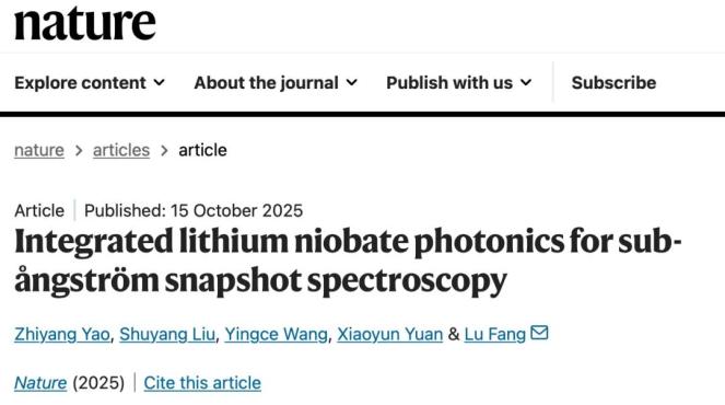 清華大學(xué)電子工程系方璐教授課題組另辟蹊徑,首創(chuàng)了可重構(gòu)計(jì)算光學(xué)成像架構(gòu),研制了高分辨光譜成像芯片“玉衡”,實(shí)現(xiàn)了亞埃米級光譜分辨率、千萬像素級空間分辨率的快照光譜成像。該研究成果以《集成鈮酸鋰光子學(xué)亞埃米級快照光譜成像》(“Integrated lithium niobate photonics for sub-angstrom snapshot spectroscopy”)為題,于10月15日在線發(fā)表于《自然》(Nature)。