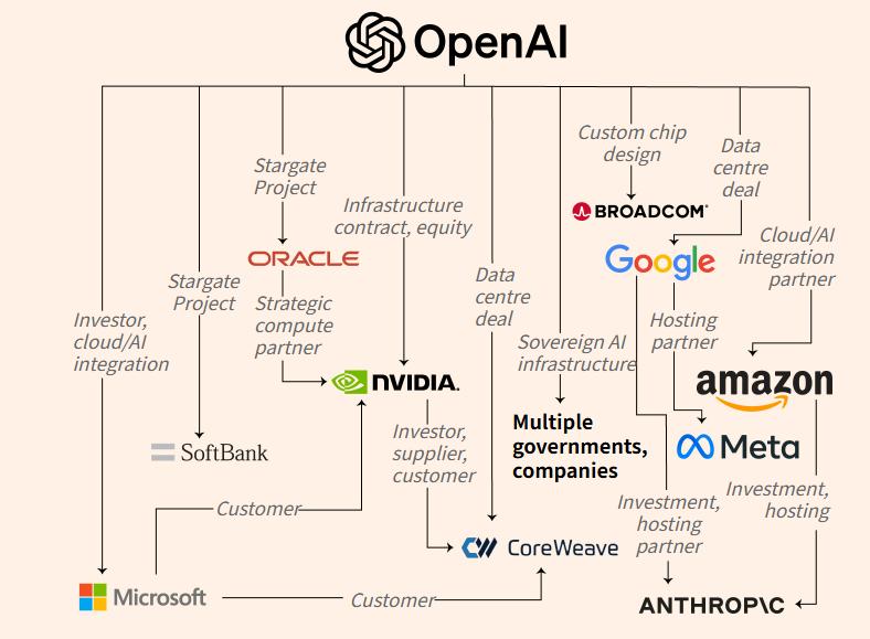 OpenAI的巨額開支引發(fā)了廣泛的經(jīng)濟(jì)擔(dān)憂。美國多家高價(jià)值公司與OpenAI深度綁定,加劇了市場對AI引發(fā)金融泡沫的憂慮。