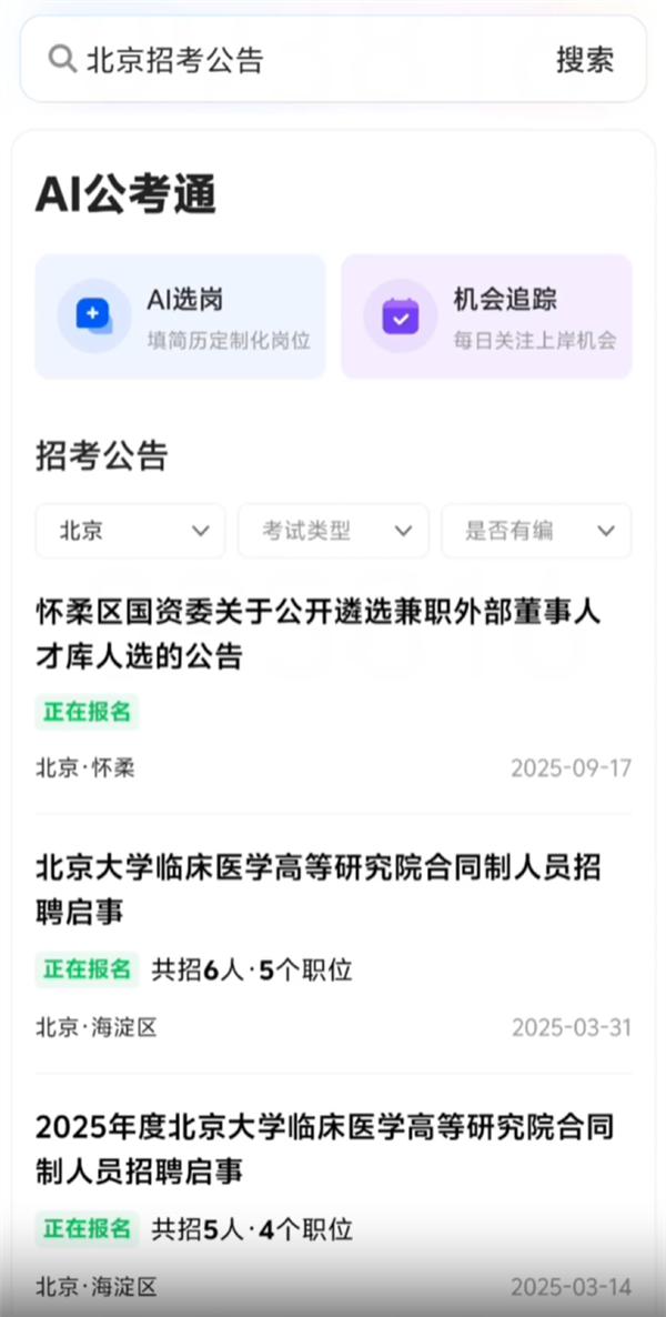 例如,考生輸入“北京招考公告”或“山東招考公告”,就能直接獲取準(zhǔn)確的公告內(nèi)容,大大節(jié)省了查找時間。