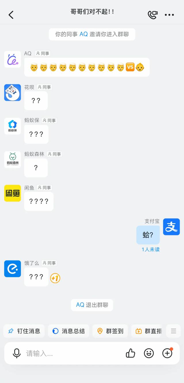 雖然支付寶和AQ友誼的小船說翻就翻,但峰終定律告訴我們一切最終都是好事。AQ拉兄弟們進群,群名“哥哥們對不起??!”,結(jié)果卻發(fā)了一串表情包后自個退群了。有人點破這是AQ罵哥哥們都是“老登”。