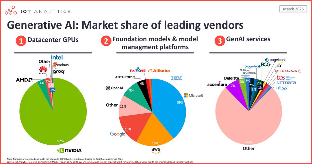 據(jù)IoT Analytics 2025報(bào)告數(shù)據(jù)顯示,截至2025年第二季度,在數(shù)據(jù)中心GPU市場,英偉達(dá)占據(jù)主導(dǎo)地位,市場份額達(dá)到92%。