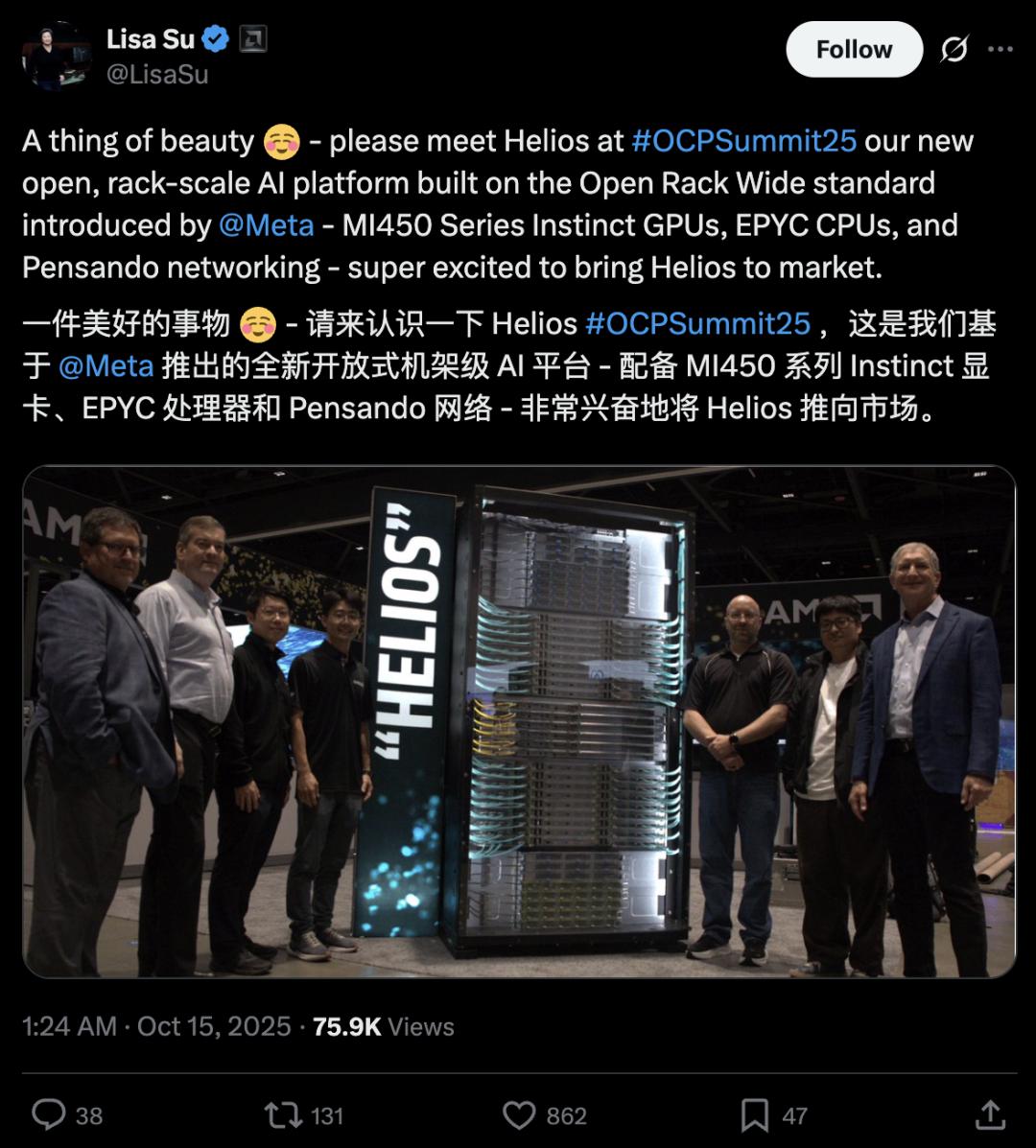 蘇姿豐在社交媒體上,將搭載了Instinct MI450系列GPU的Helios稱為‘杰出之作’,并表示很高興將其推向市場。