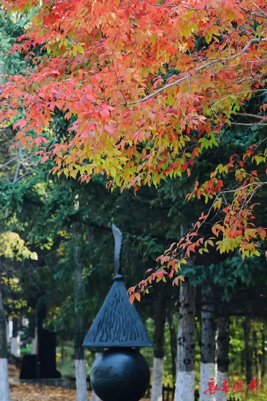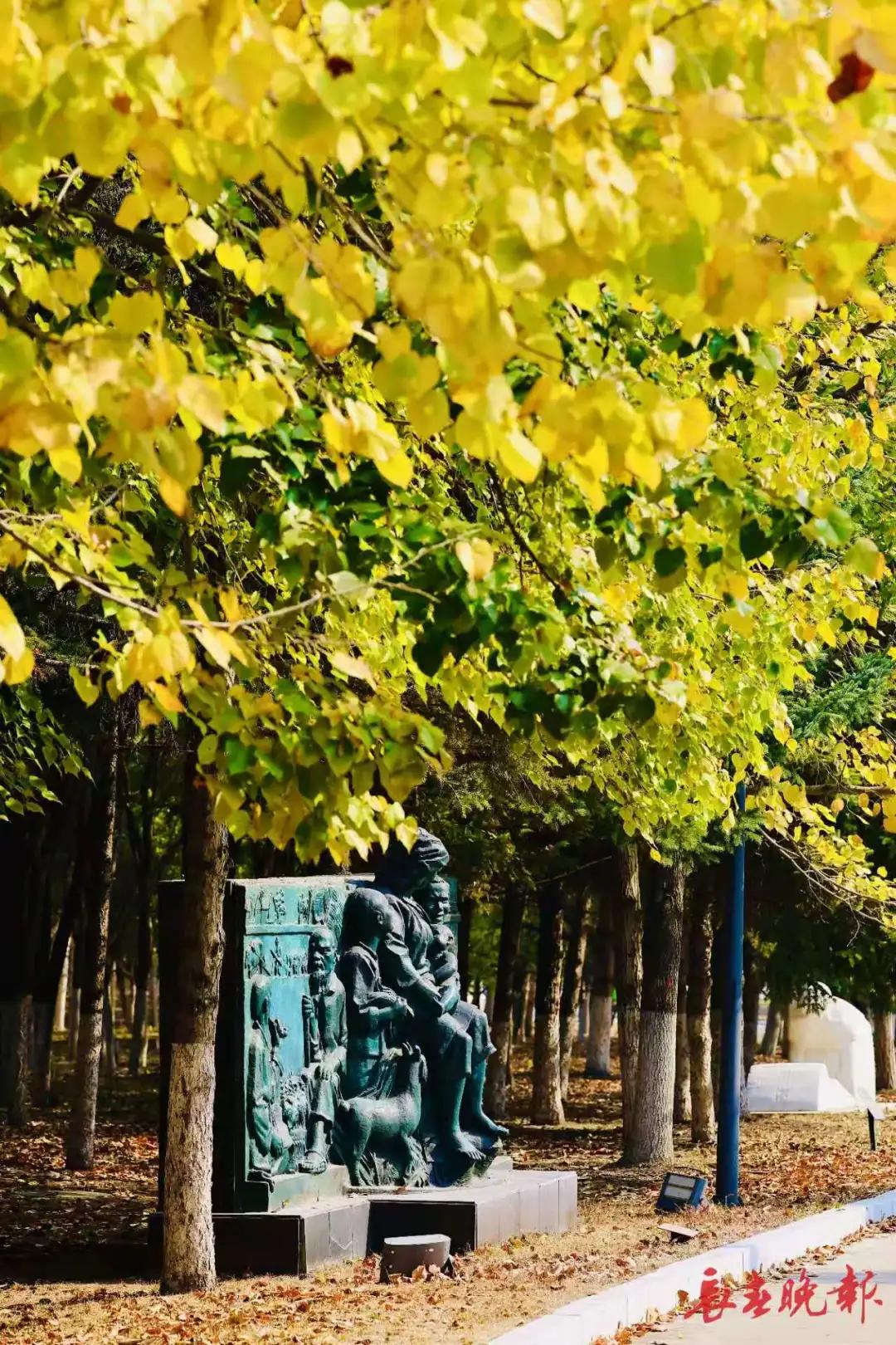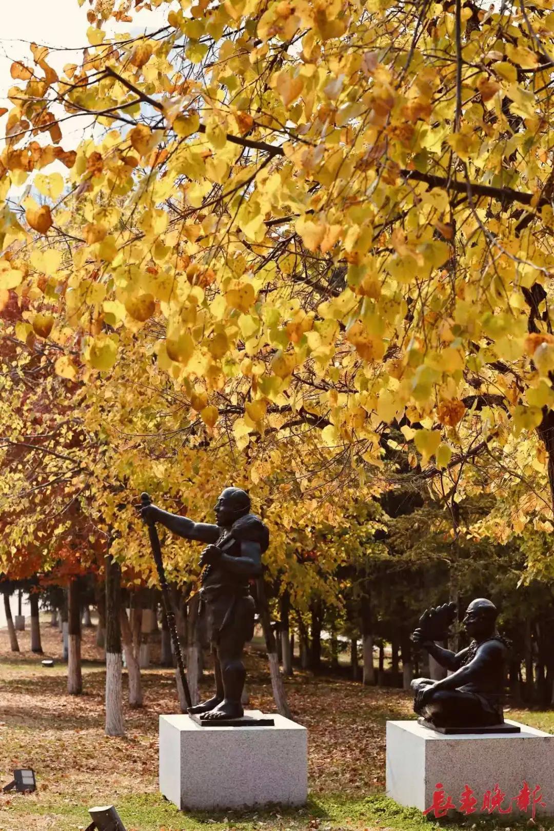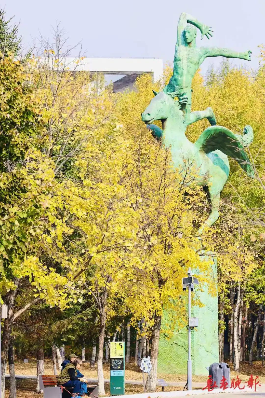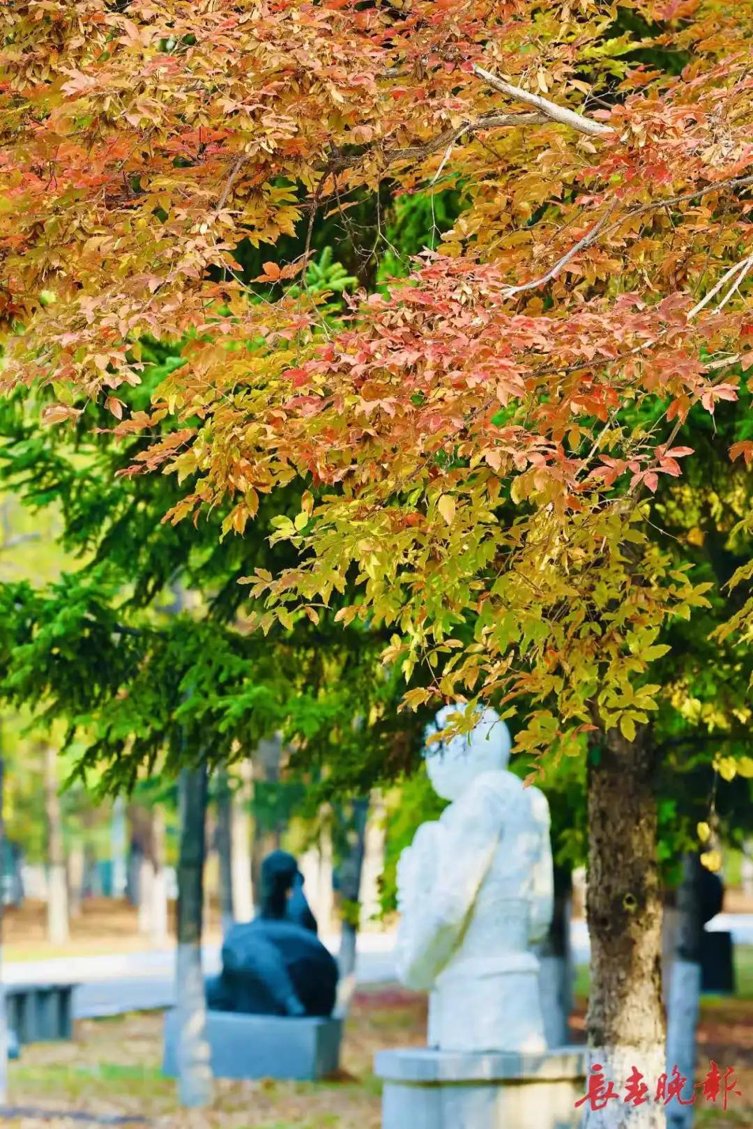 長春世界雕塑園披上了五彩斑斕的秋裝,金黃、赭紅、翠綠的樹葉交織成一幅色彩濃郁的油畫。