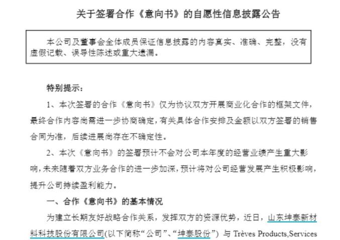 坤泰股份強(qiáng)調(diào),《意向書(shū)》只是開(kāi)展商業(yè)化合作的框架文件,最終合作內(nèi)容需進(jìn)一步協(xié)商確定,具體合作安排及金額以雙方簽署的銷(xiāo)售合同為準(zhǔn),后續(xù)進(jìn)展存在不確定性。而且,《意向書(shū)》的簽署預(yù)計(jì)不會(huì)對(duì)本年度經(jīng)營(yíng)業(yè)績(jī)產(chǎn)生重大影響,但隨著雙方業(yè)務(wù)合作加深,預(yù)計(jì)將對(duì)經(jīng)營(yíng)發(fā)展產(chǎn)生積極影響,提升持續(xù)盈利能力。