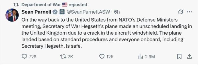 據(jù)BBC報道,五角大樓在X平臺透露,10月15日,美國國防部長皮特·赫格塞斯(Pete Hegseth)乘坐的專機(jī)在返回美國途中,因“風(fēng)擋玻璃出現(xiàn)裂紋”,意外降落在英國。