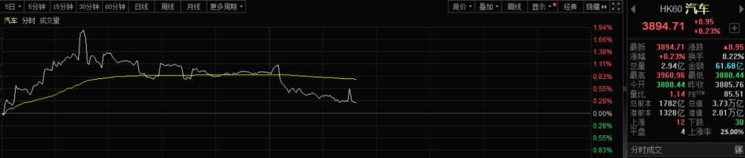 按理來說,上述消息還有利于新能源汽車的演繹。而實際上,無論是港股的汽車板塊還是A股整車板塊指數(shù),下午都保持了相對強勢。港股汽車板塊上漲一度沖高近2%,午后依然保持紅盤。