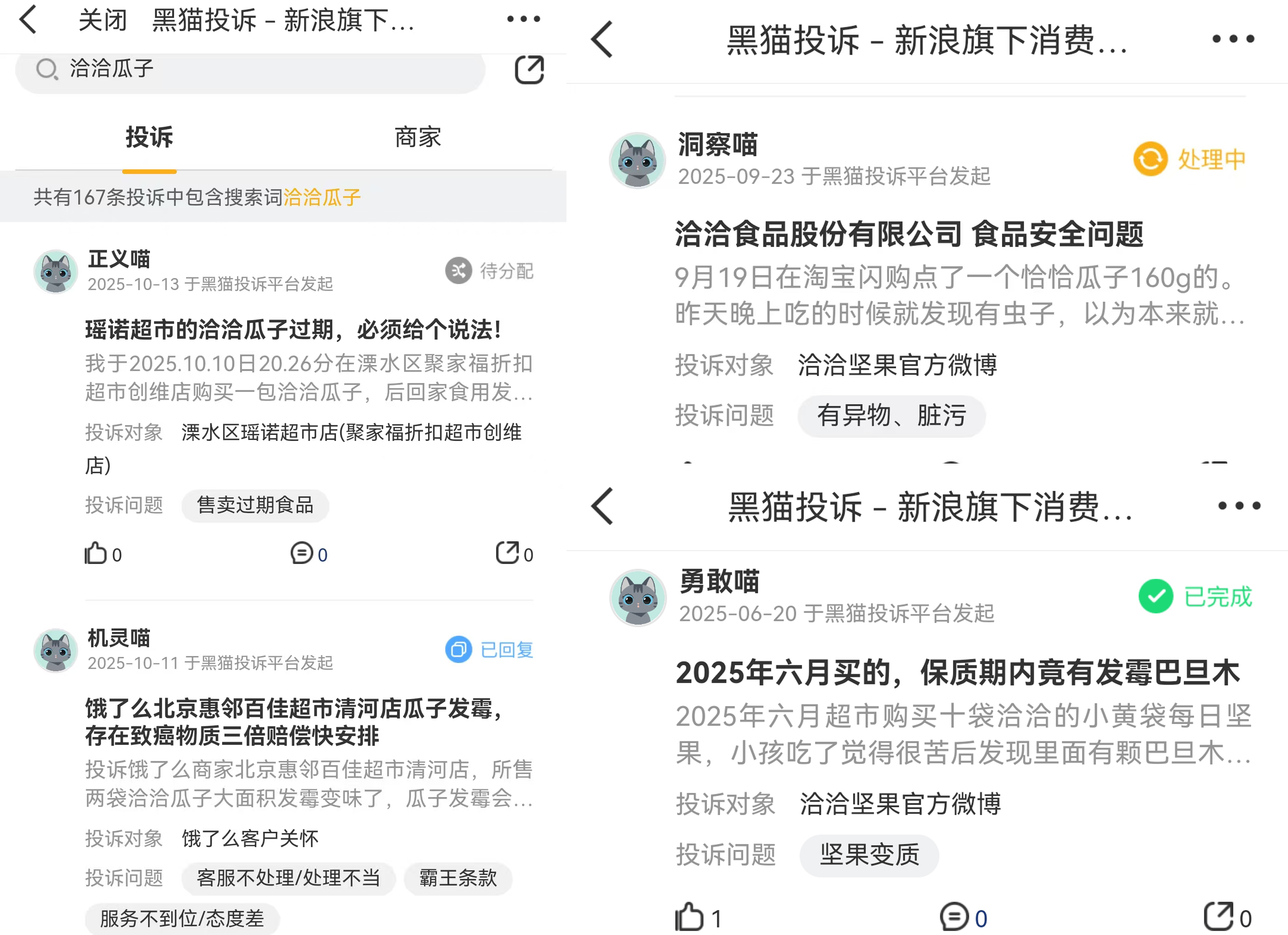 在微博、小紅書等社媒平臺,對洽洽產(chǎn)品的吐槽眾多,包括“瓜子發(fā)霉”“品控不嚴”“品質(zhì)越來越差”“難吃”等。在黑貓投訴平臺,產(chǎn)品質(zhì)量問題也是洽洽食品被投訴的重災區(qū),如“有蟲卵”“瓜子壞果多”“發(fā)霉發(fā)苦”等。