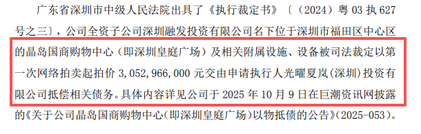 這筆債原是皇庭國(guó)際子公司融發(fā)投資,以深圳皇庭廣場(chǎng)作為抵押,找中信信托借錢欠下的。2024年7月,中信信托將債權(quán)轉(zhuǎn)給了光曜夏嵐。深圳皇庭廣場(chǎng)位于深圳CBD福田區(qū)的核心位置,是深圳的地標(biāo)性商業(yè)項(xiàng)目之一,因地段好被稱作深圳CBD的“鉆石之心”。據(jù)公告,2024年底,皇庭廣場(chǎng)價(jià)值57.498億元。