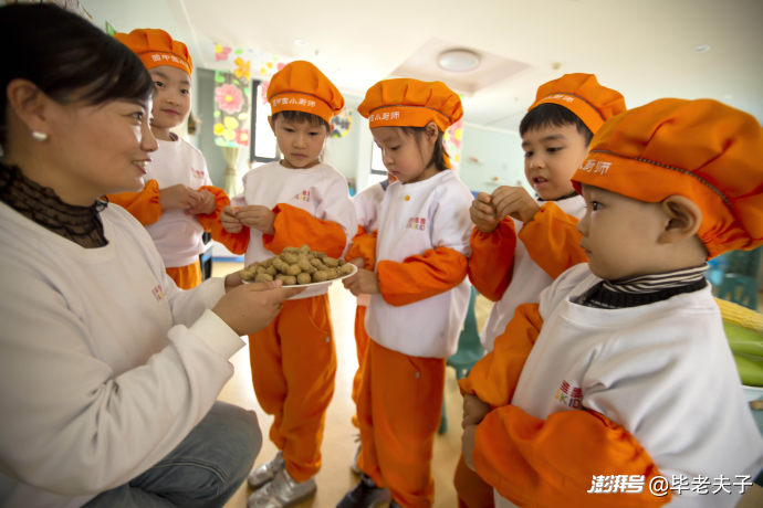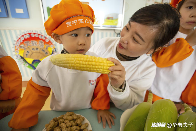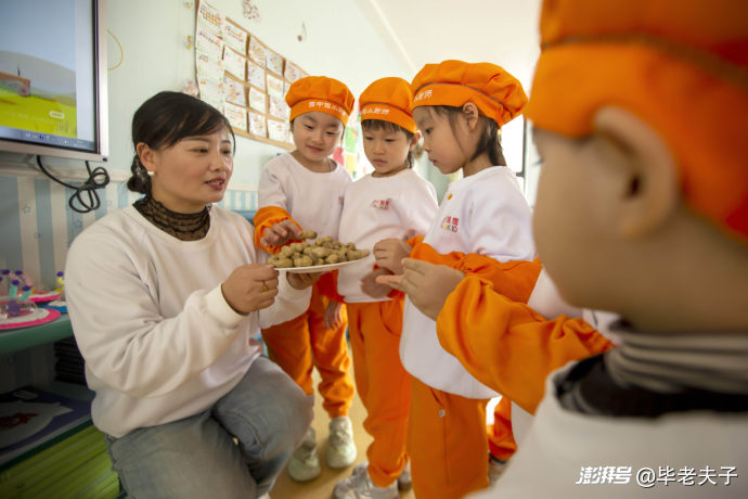 園長李老師手托一盤鮮花生,引導(dǎo)孩子們仔細觀察,讓他們充分認識并記住花生的模樣。