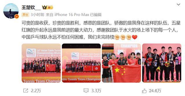 王楚欽在發(fā)文中特別感恩團(tuán)隊(duì),稱(chēng)“驕傲的是我身在這樣的隊(duì)伍”。這種團(tuán)隊(duì)意識(shí)也是他克服疲憊的重要力量。在本屆亞錦賽上,中國(guó)男團(tuán)派出了王楚欽、林詩(shī)棟、梁靖崑、向鵬和周啟豪的陣容,這是一支新老結(jié)合的隊(duì)伍,既有世界頂級(jí)的實(shí)力派,又給了年輕人鍛煉機(jī)會(huì),團(tuán)隊(duì)協(xié)作精神在這場(chǎng)比賽中得到充分體現(xiàn);女團(tuán)同樣出色,由孫穎莎、王曼昱、陳幸同、蒯曼和王藝迪領(lǐng)銜的隊(duì)伍,在決賽中與日本隊(duì)激戰(zhàn),孫穎莎賽后發(fā)文表示:“大家齊心協(xié)力共同捍衛(wèi)了國(guó)乒的榮譽(yù)”。