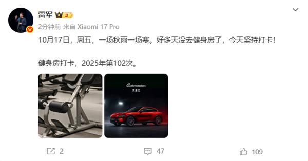 快科技10月17日消息,今日清晨,雷軍分享了健身動態(tài),配文稱:“10月17日,周五,一場秋雨一場寒。好多天沒去健身房了,今天堅持打卡!健身房打卡,2025年第102次”。