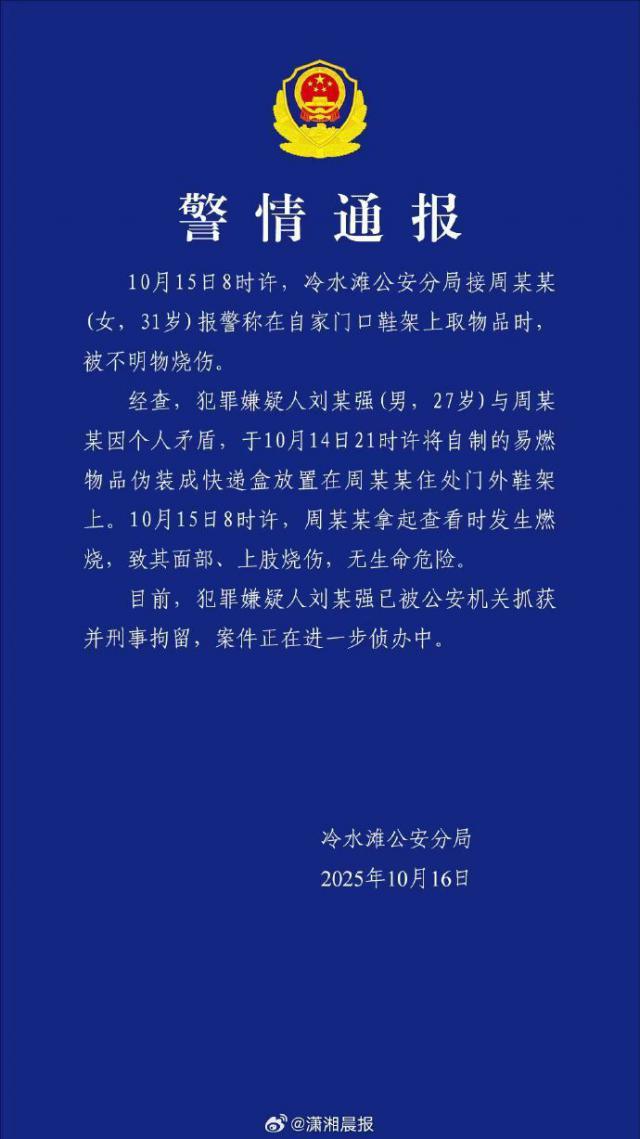 10月16日,湖南冷水灘公安分局發(fā)布警情通報。10月15日8時左右,冷水灘公安分局接到周某某(女,31歲)報警,稱她在自家門口鞋架上取物品時,被不明物燒傷。