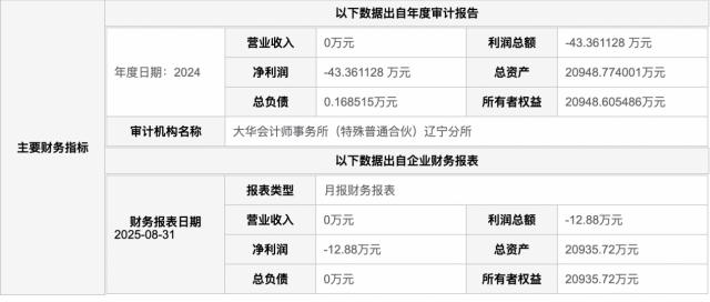 財(cái)務(wù)數(shù)據(jù)顯示,2024年、2025年前8月,標(biāo)的企業(yè)營收均為0萬元,凈虧損分別為43.36萬元、12.88萬元。截至2025年8月末,標(biāo)的企業(yè)總資產(chǎn)為2.09億元,總負(fù)債為0萬元。
