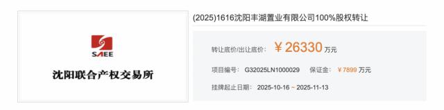樂居財(cái)經(jīng) 劉治穎 10月16日消息,沈陽地鐵經(jīng)營有限公司掛牌轉(zhuǎn)讓沈陽豐湖置業(yè)有限公司100%股權(quán),轉(zhuǎn)讓底價(jià)達(dá)26330萬元,披露結(jié)束日期為2025 - 11 - 13。