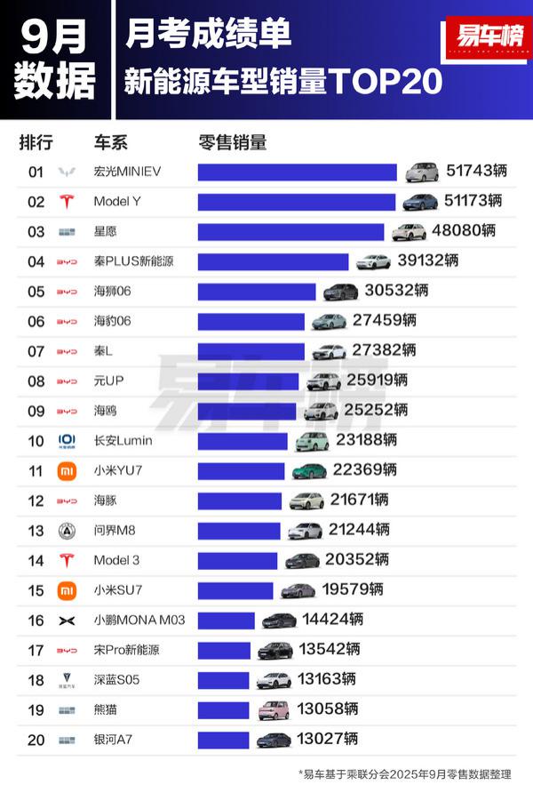 2025年9月新能源車型銷量TOP20揭曉 小米YU7位居第11