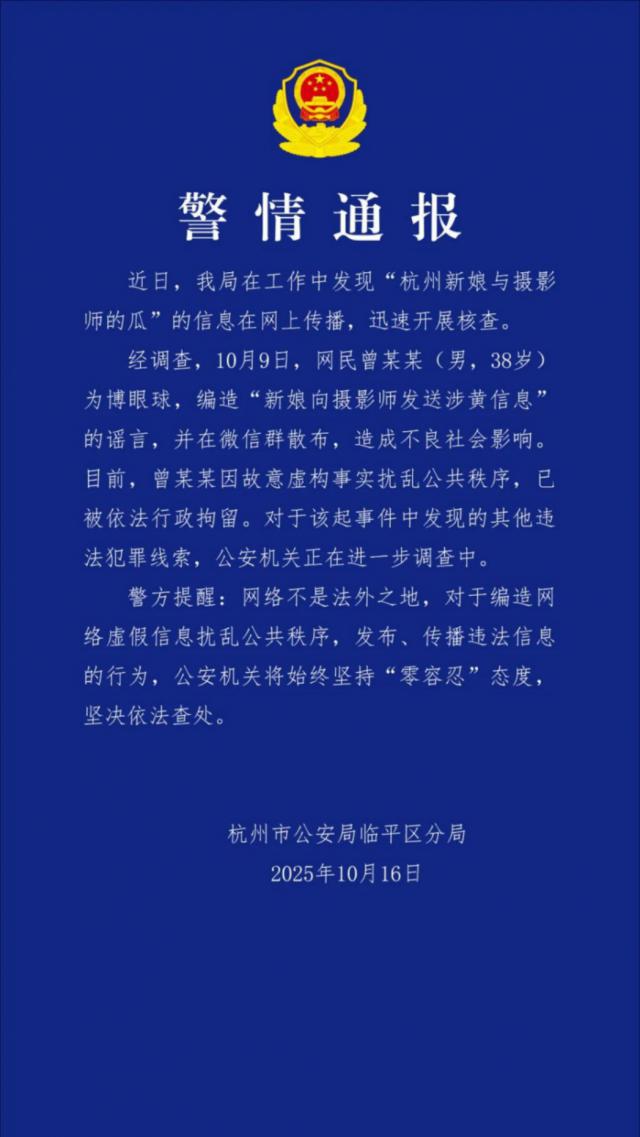 杭州警方通報(bào),男子編造“新娘向攝影師發(fā)送涉黃信息”謠言,已被行政拘留。貴州畢節(jié)金沙一溶洞排出大量黑水,當(dāng)?shù)卣硎痉浅V匾?,正在處理中。蘭州一醫(yī)院發(fā)喜報(bào)慶祝門(mén)診人數(shù)創(chuàng)佳績(jī),醫(yī)院回應(yīng)用詞不當(dāng),正處理。遼寧一4歲女童在車內(nèi)睡醒后翻出車窗失聯(lián),當(dāng)?shù)鼐?、救援?duì)等合力連夜搜救。