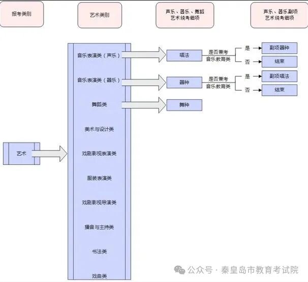 Ⅱ、藝術(shù)類:報考藝術(shù)類選藝術(shù),報名時從10個“藝術(shù)類別”選1類,不可兼報,部分類別有兼考和細項填報要求。具體報考流程見以下圖例。