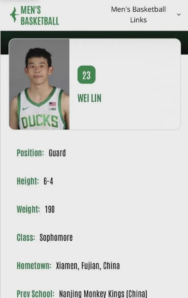 從俄勒岡大學(xué)的注冊信息可知,林葳是大二學(xué)生,身披23號球衣,身高1米93,體重86公斤。
