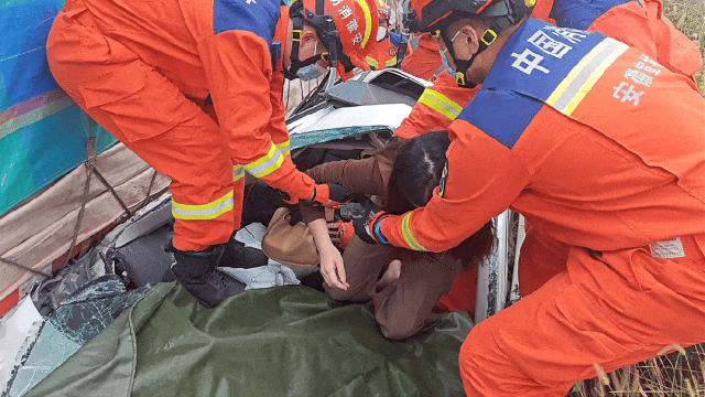 接警后,消防員迅速趕赴現(xiàn)場(chǎng)。只見一輛白色小轎車被夾在滿載貨物的大貨車和路邊護(hù)欄之間,車身在“夾擊”下嚴(yán)重變形,車門無法打開,車內(nèi)三名人員不同程度受傷。