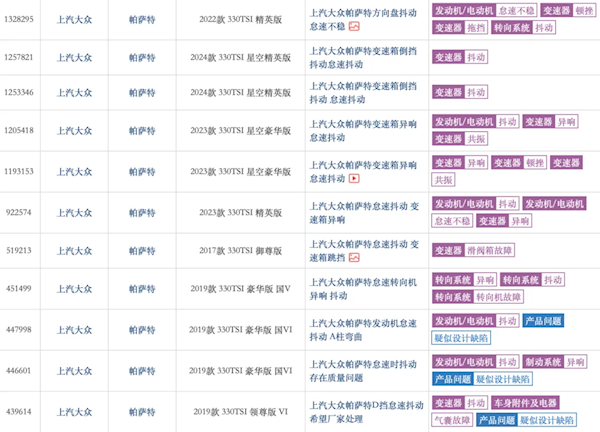 此外,反映大眾帕薩特怠速抖動(dòng)的車主不止續(xù)先生一人。汽車第三方投訴平臺(tái)車質(zhì)網(wǎng)顯示,多位車主反映自己的車存在變速箱跳檔、發(fā)動(dòng)機(jī)怠速異常抖動(dòng)的問題。