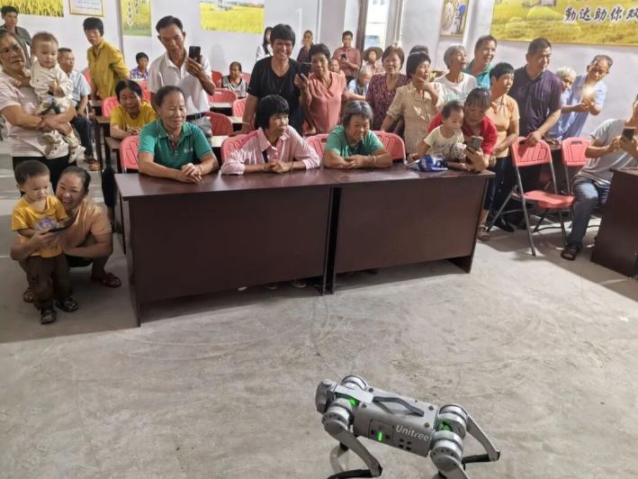 企業(yè)職工和周邊群眾在觀看機(jī)器狗表演