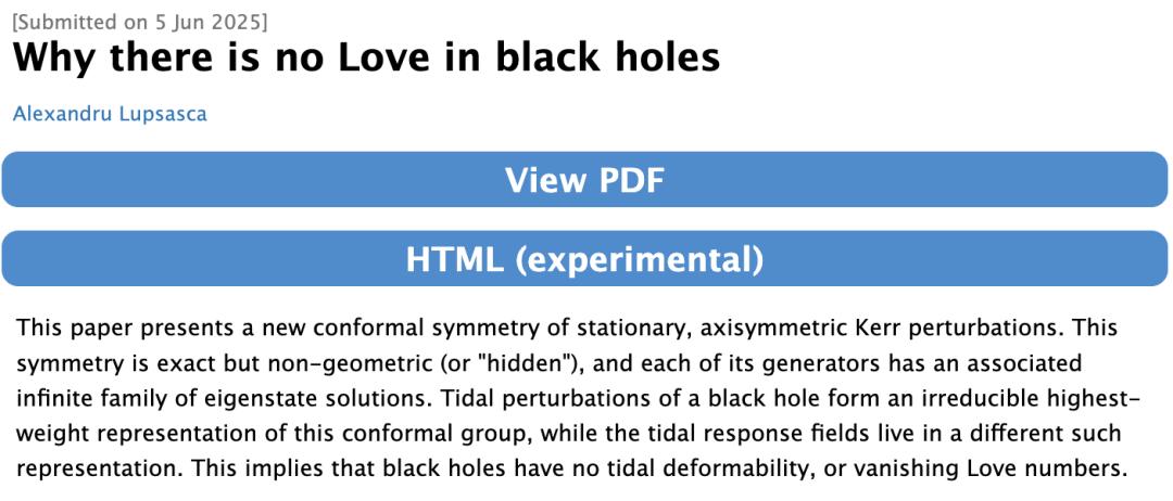 今年夏天,老盧發(fā)表了一篇關(guān)于黑洞微擾理論中新對(duì)稱性的論文,指出黑洞沒有潮汐形變能力,即勒夫數(shù)為零。對(duì)他來說,解釋這些對(duì)稱性的物理意義相對(duì)容易,難的是找到它們的精確形式。他作為人類科學(xué)家,花了數(shù)天才計(jì)算出相關(guān)公式。