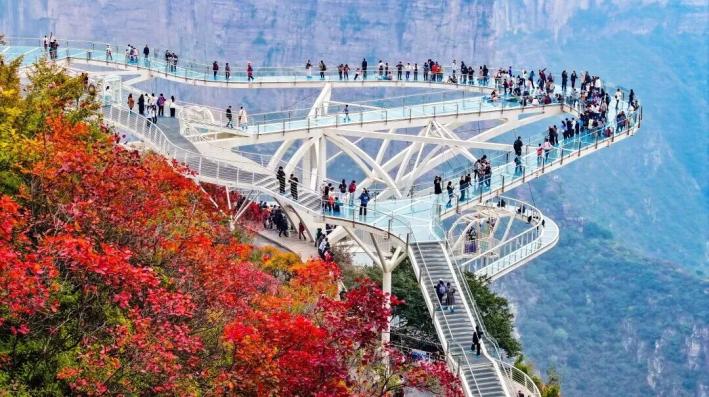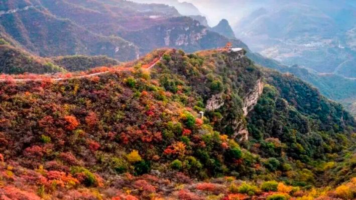 王屋山萬(wàn)山紅遍,層林盡染,就像白居易詩(shī)中寫(xiě)的“石泉碧漾漾,巖樹(shù)紅離離”。如詩(shī)如畫(huà)的紅葉進(jìn)入了最佳觀(guān)賞期。游客漫步在山間步道上,可以近距離欣賞紅葉與巖壁相互映襯的美景;登上高處,極目遠(yuǎn)眺,能看到整個(gè)山谷仿佛披上了紅色的錦繡,令人心情格外舒暢。