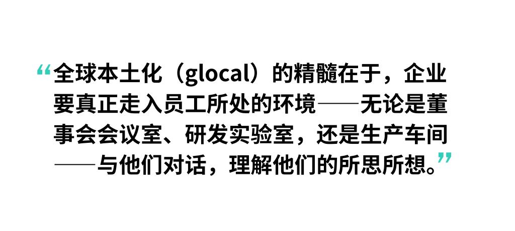 Kowalski提到“全球本地化”(glocalization)的概念,即同時(shí)具備全球化視野與本地化思維的能力。“高層傳遞的消息必須是人人都能認(rèn)同的普遍理念?!彼f,“全球本土化的精髓在于,企業(yè)要真正走入員工所處的環(huán)境——無論是董事會(huì)會(huì)議室、研發(fā)實(shí)驗(yàn)室,還是生產(chǎn)車間——與他們對(duì)話,理解他們的想法?!?/p>