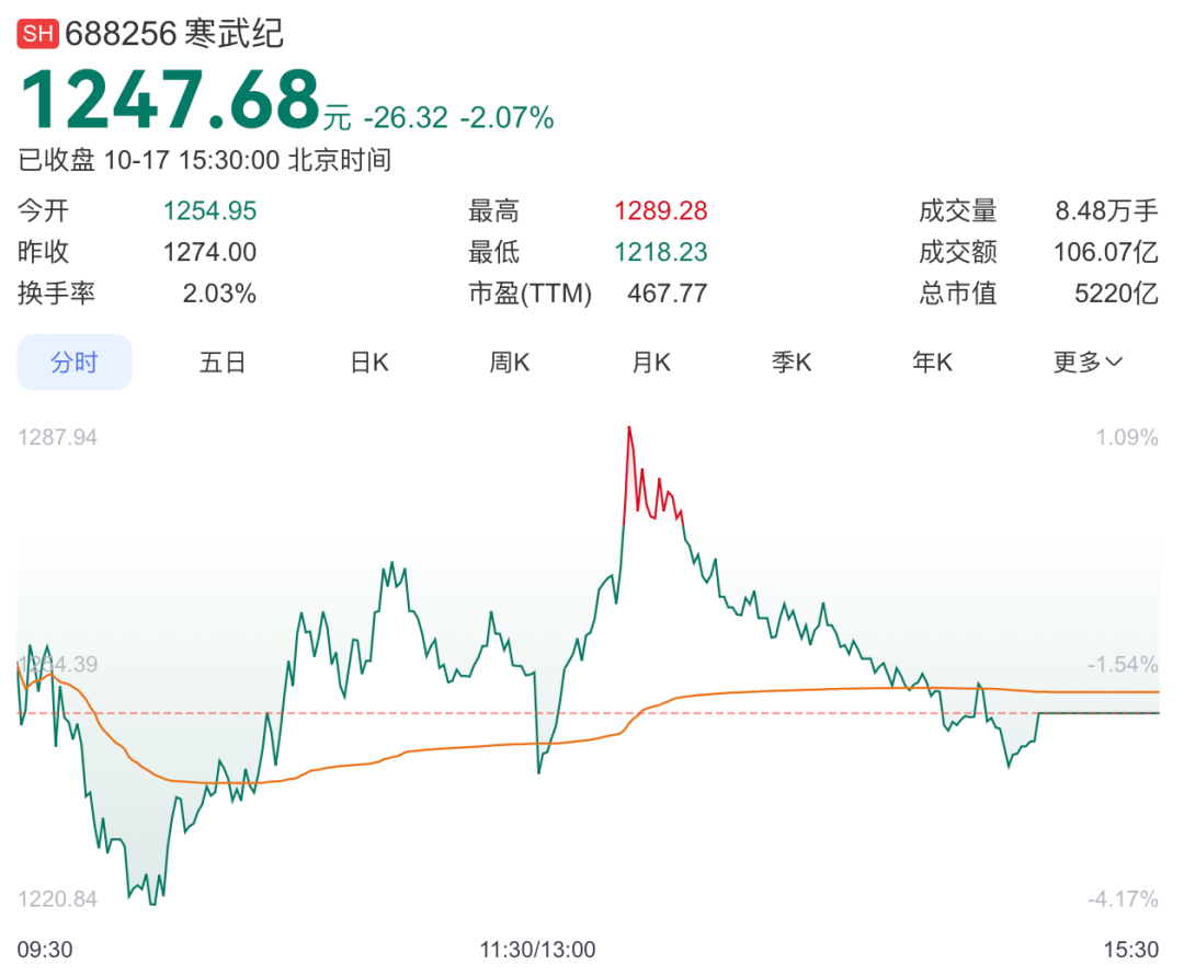 在行情方面,截至10月17日收盤,寒武紀股價報1247.68元/股,總市值達到5220億元。