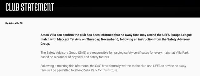 10月16日,英超阿斯頓維拉俱樂部宣布,11月6日歐聯(lián)杯聯(lián)賽階段第四輪主場對陣以色列特拉維夫馬卡比的比賽,將不允許客隊球迷入場。該禁令由負責(zé)主場維拉公園球場賽事安全許可的“安全咨詢小組(SAG)”決定。